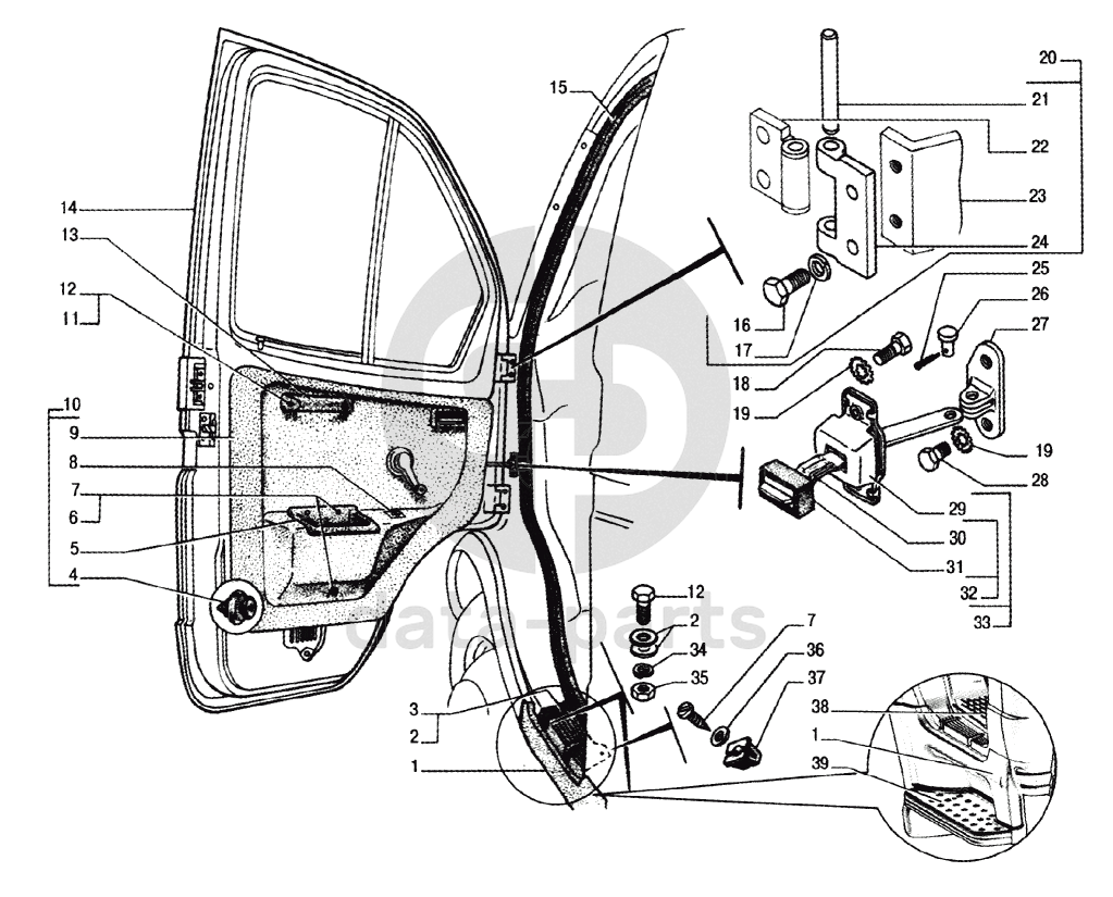 Дверь, навеска дверей, поручень, ящик аптечки, кант проема передних дверей, подножка ГАЗ-33104 Валдай