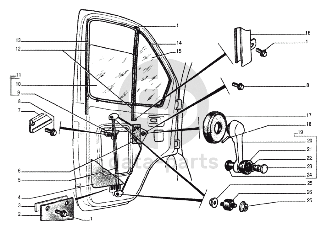 Стекло неподвижное передних дверей, стекло опускное, уплотнители стекол, механизм стеклоподъемника ГАЗ-33104 Валдай