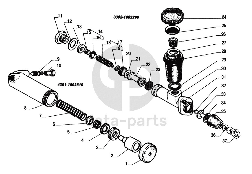 Детали главного и рабочего цилиндров привода выключения сцепления ГАЗ-33104 Валдай