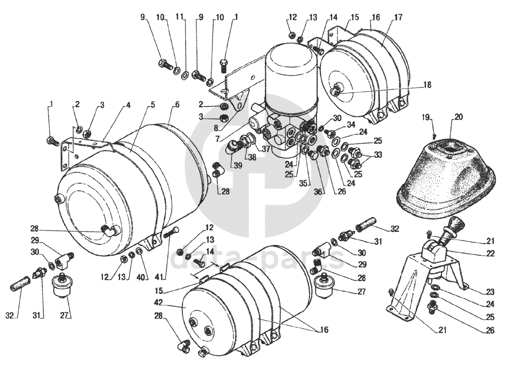 Кран управления стояночным тормозом, воздушные баллоны, воздухоосушитель, датчики давления воздуха ГАЗ-33104 Валдай