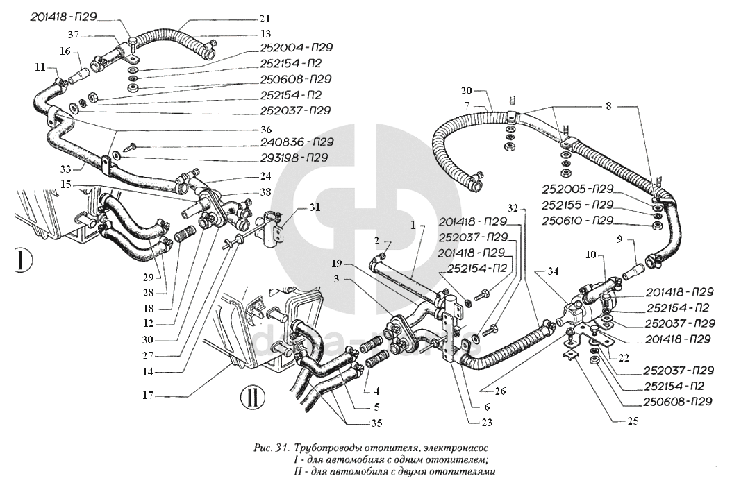 Трубопроводы отопителя, электронасос: I - для автомобилей с одним отопителем, II - для автомобиля с двумя отопителями ГАЗ-560