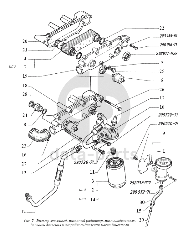 Фильтр масляный, масляный радиатор, маслоотделитель, датчики давления и аварийного давления масла двигателя ГАЗ-560