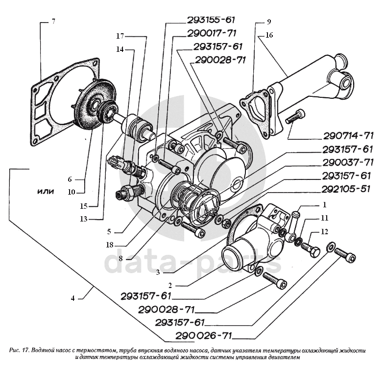 Водяной насос с термостатом, труба впускная водяного насоса, датчик указателя температуры охлаждающей жидкости и датчик температуры охлаждающей жидкости системы управления двигателем ГАЗ-560