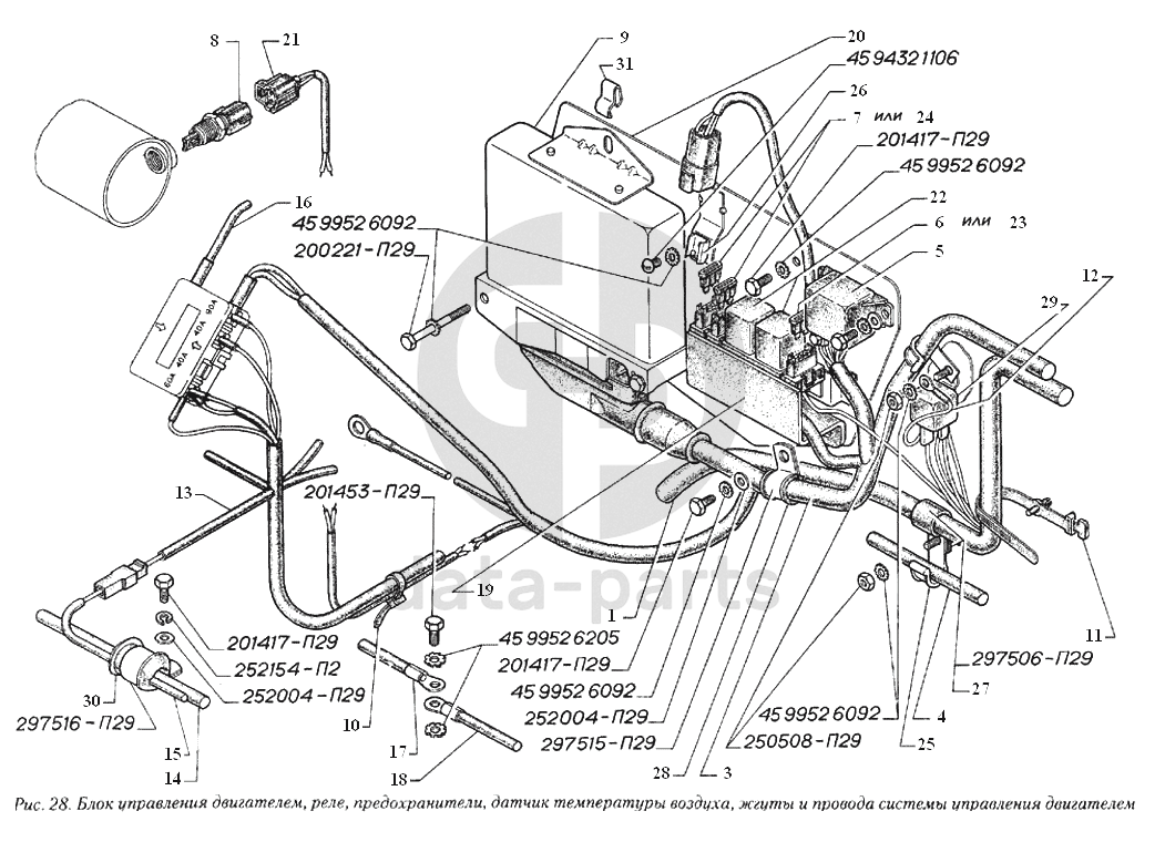 Блок управления двигателем, реле, предохранители, датчик температуры воздуха, жгуты и провода системы управления двигателем ГАЗ-560