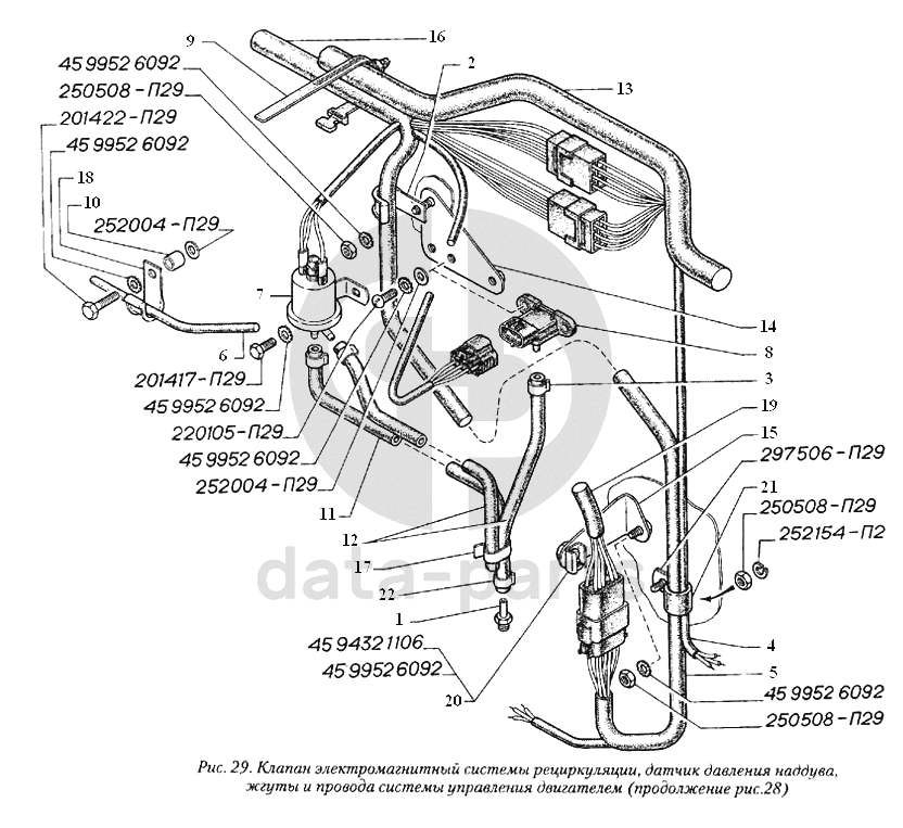 Клапан электромагнитной системы рециркуляции, датчик давления наддува, жгуты и провода системы управления двигателем ГАЗ-560